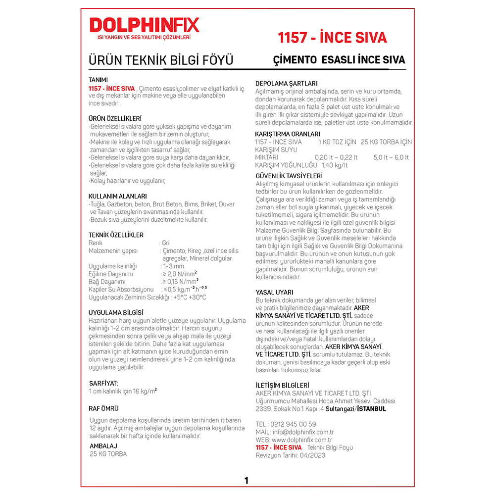 TANIMI : 1157 – İNCE SIVA , Çimento esaslı,polimer ve elyaf katkılı iç ve dıs mekanlar için makine veya elle uygulanabilen ince sıvadır .