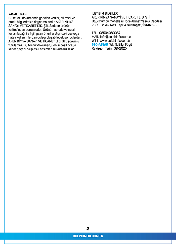 TANIMI: 760-ASTAR, Iki bilesenli, solventsiz ve saydam epoksi astar; atmosferik ortamlarda beton zemin ve duvarlara yüksek yapısma saglayarak zemin kaplamalarında kullanılır.