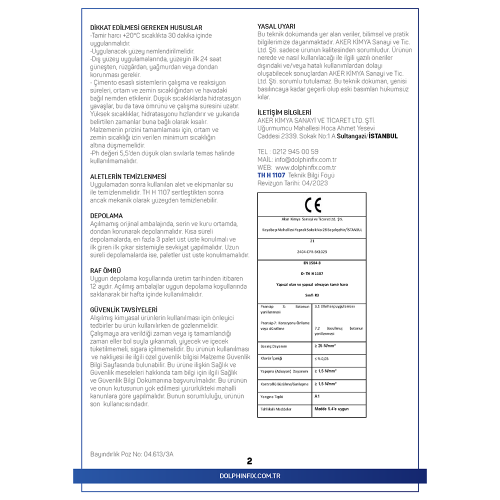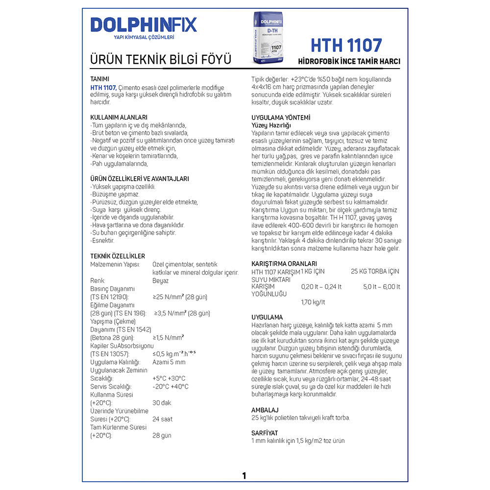 tıkaç ile kapatılmalıdır. Uygulama yüzeyi suya doyurulmalı fakat yüzeyde serbest su kalmamalıdır. Karıştırma Uygun su miktarı, bir ölçek yardımıyla temiz karıştırma kovasına boşaltılır. TH H 1107, yavaş yavaş ilave edilerek 400-600 devirli bir karıştırıcı ile homojen ve topaksız bir karışım elde edilinceye kadar 4 dakika karıştırılır. Yaklaşık 4 dakika dinlendirilip tekrar 30 saniye karıştırıldıktan sonra malzeme kullanıma hazır hale gelir.