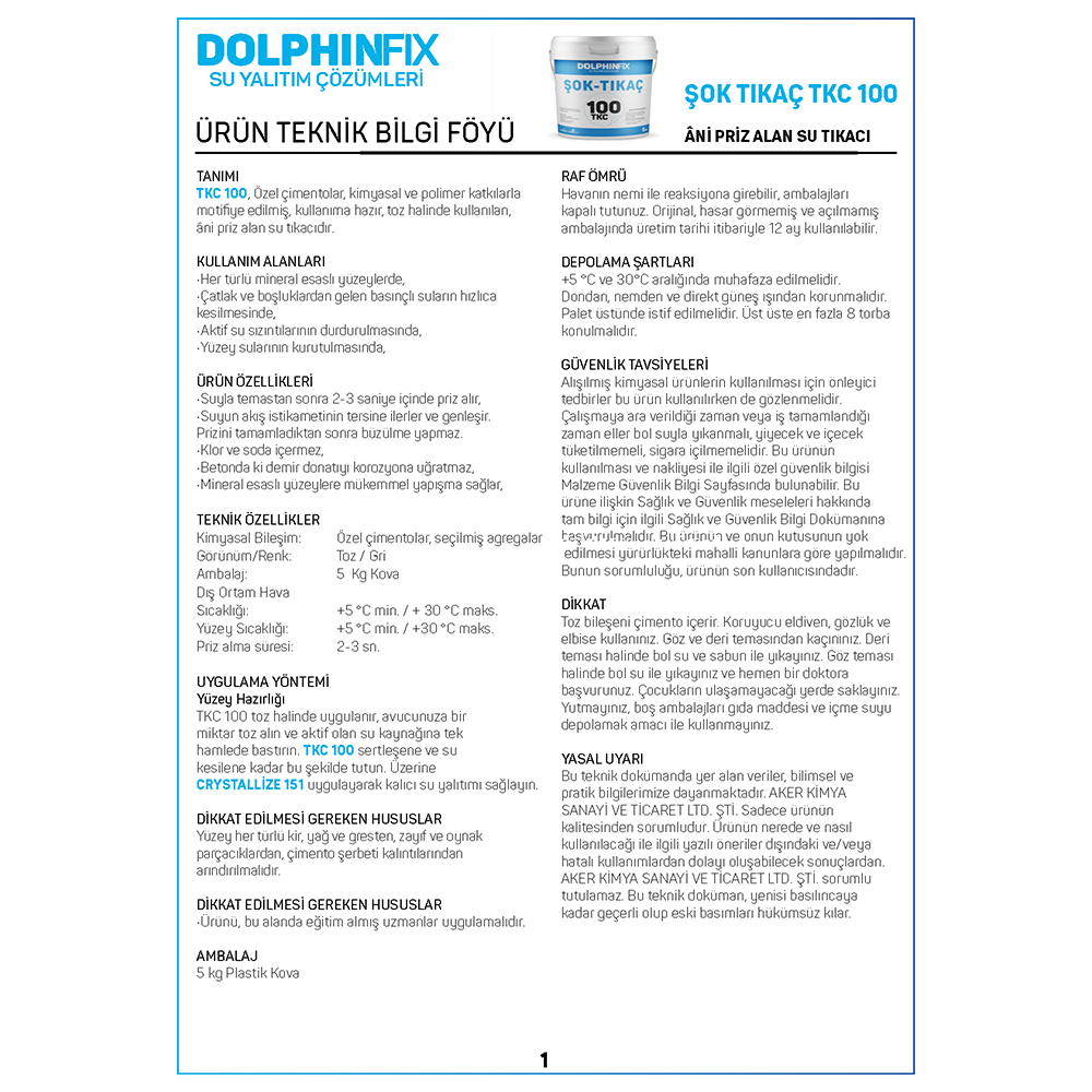 TANIMI : TKC 100, Özel çimentolar, kimyasal ve polimer katkılarla motifiye edilmis, kullanıma hazır, toz halinde kullanılan, âni priz alan su tıkacıdır.